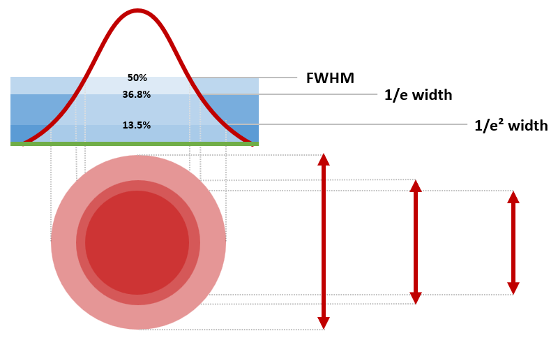 - 1/e² width: The peak is cut where the power is at 1/e² which equals to 0.135 times the maximum in the center of the beam. This definition is frequently used because the 2-dimensional Gaussian distribution allows to easily calculate the diameter at this level.