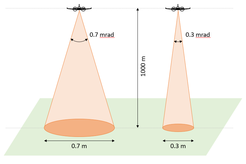 Knowing now that the signal spreads with distance it becomes clear that the higher a survey aircraft flies the larger the resulting signal footprint on the ground will be. The beam divergence is normally given in mrad, which makes it easy to calculate the footprint diameter at a given flying altitude.