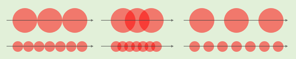 The image above shows examples of pulse spacing equal to footprint diameter (left), shorter than footprint diameter (center) and larger than the footprint diameter (right).